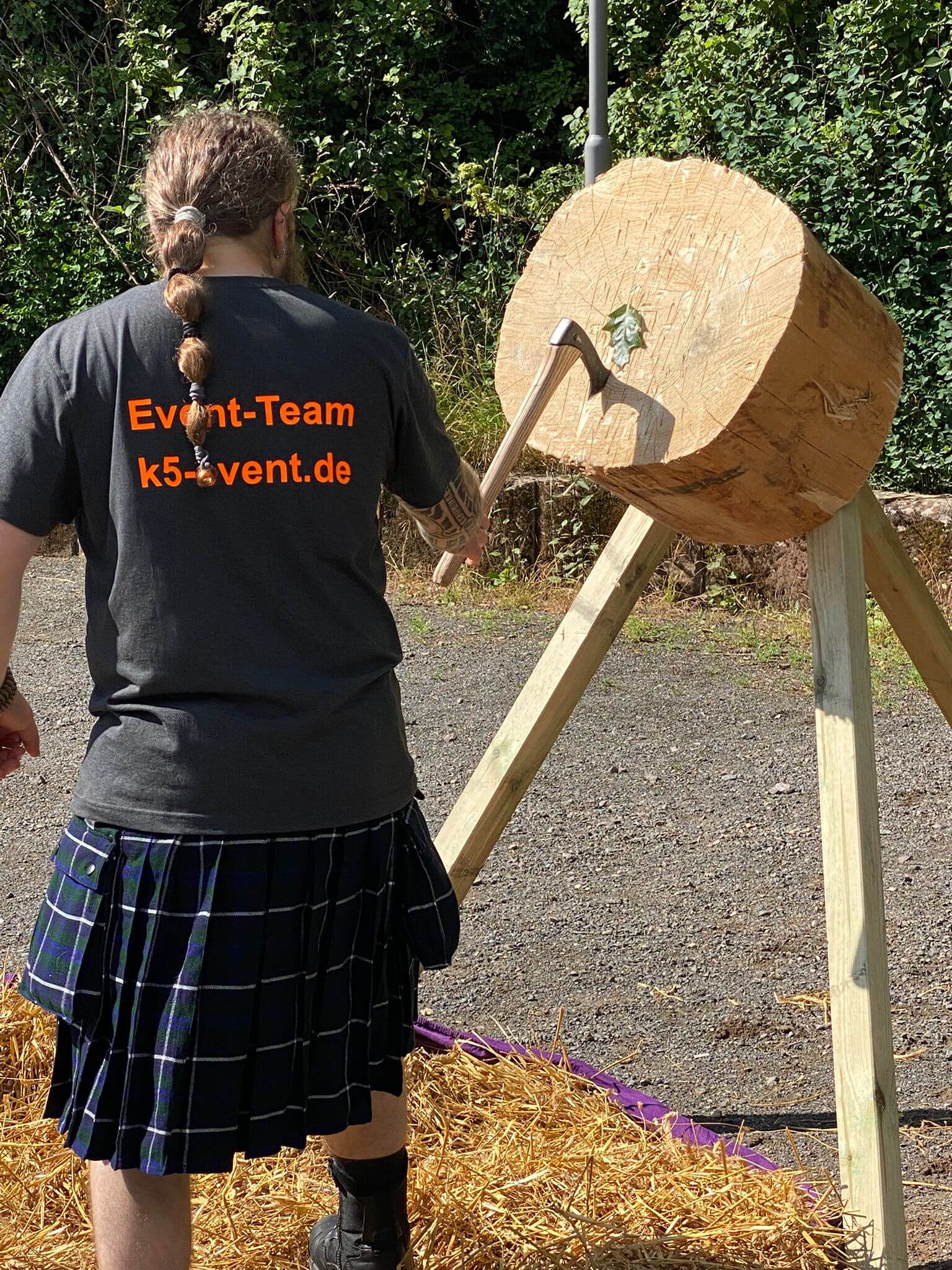 Das K5 Axtwerfen kombiniert sich super zum Beispiel mit dem Baumstammhalten, dem verflixten Fass oder der Wallace Monument Challenge. Schicken Sie uns doch eine unverbindliche Anfrage zu Ihrer Veranstaltung – wir stehen Ihnen gerne mit unserer langjährigen Eventerfahrung zur Seite.