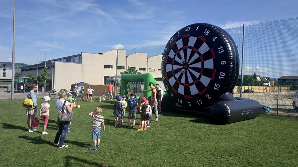 Fußball-Dart verbindet das Beste aus zwei Sportwelten: Statt auf ein Tor zielen Fußballer hier auf eine aufblasbare Dartscheibe im XXL-Format, die mit ihrer imposanten Höhe von 5,5 m alle Blicke auf sich zieht. Die Bälle werden möglichst zielgenau auf die Scheibe geschossen, die wie beim herkömmlichen Darts in 20 Teilbereiche sowie das Bullseye in der Mitte aufgeteilt ist. Besonders viele Punkte kann man auch beim Fußball-Dart in den kleinen Feldern abräumen, bei denen Treffer doppelt oder dreifach zählen.
