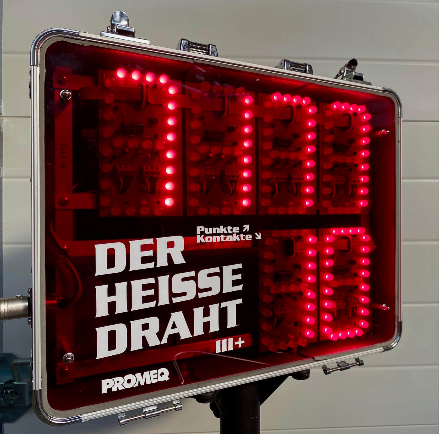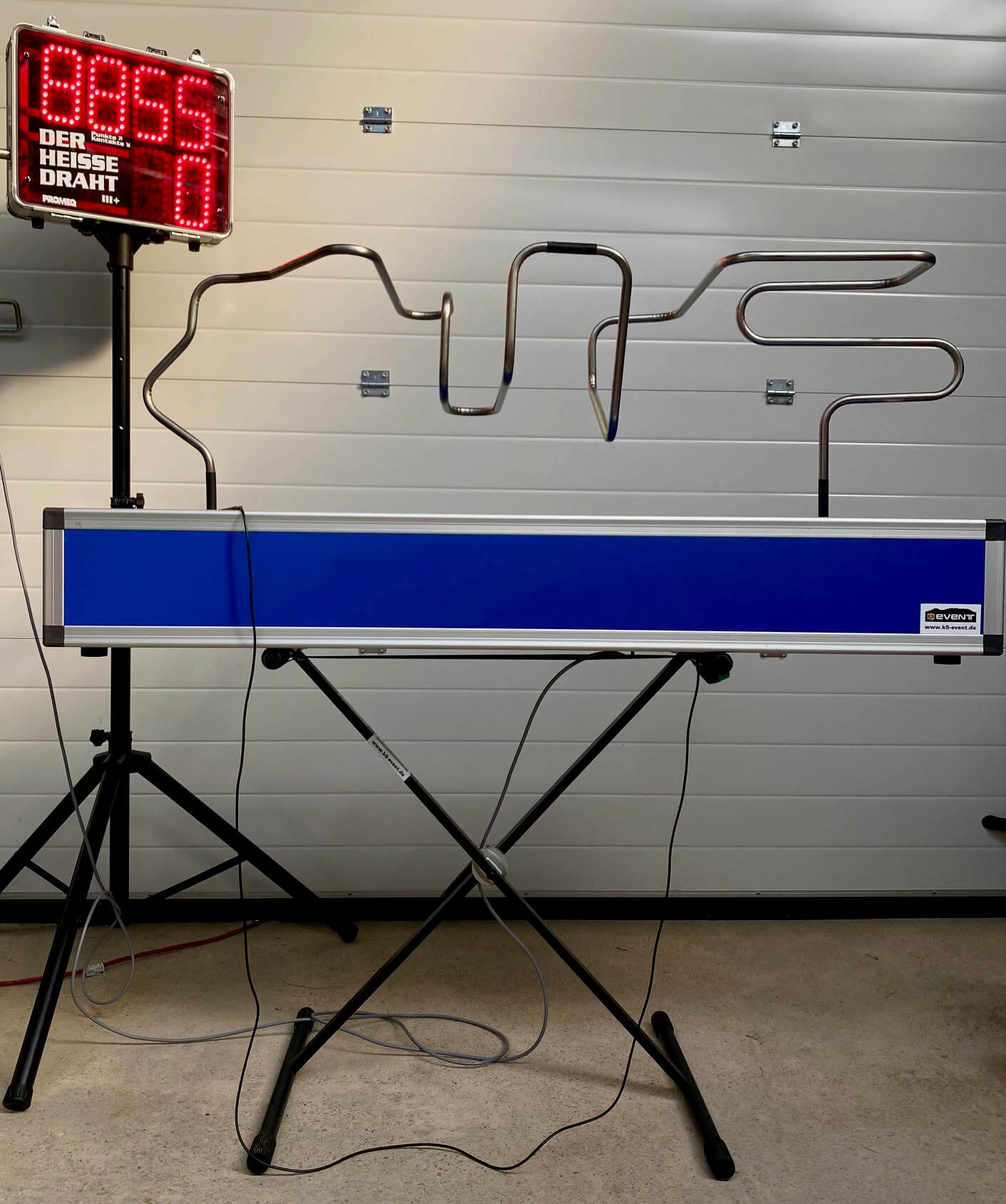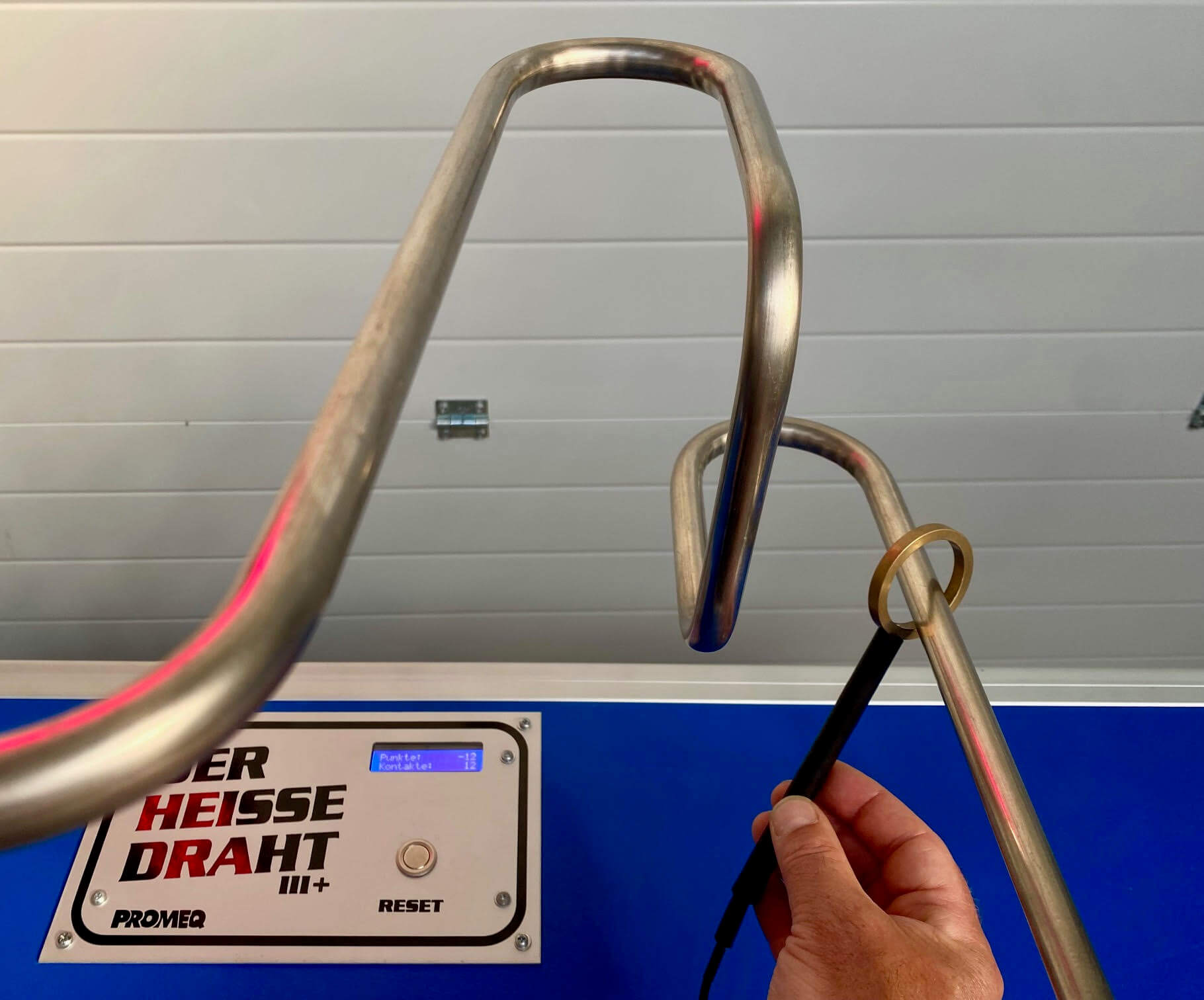 Mit unserem Heißen Draht braucht es mehr als nur eine ruhige Hand – hier zählt auch die Zeit. Jeder Spieler startet mit einem Punktekonto von 1200 Punkten. Die Aufgabe ist es, den Ring der Sonde so schnell wie möglich vom Startpunkt über das Kontaktrohr zum Ziel zu führen. Der Spielverlauf wird durch zwei Faktoren beeinflusst: die Geschwindigkeit und die Anzahl der Berührungen. Pro Sekunde werden rund 3 Punkte vom Konto abgezogen – Schnelligkeit zahlt sich also aus. Gleichzeitig gilt: Für jeden Kontakt mit dem Draht werden 50 Punkte abgezogen. Die Kombination aus Zeitdruck und Präzision macht den Reiz des Spiels aus. Start- und Zielpunkt sind mit einem akustischen Signal versehen, während eine integrierte Anzeige permanent den Punktestand und die Fehler sichtbar macht – ideal auch für Zuschauende. Das sorgt für einen spannenden, transparenten und fairen Spielverlauf.