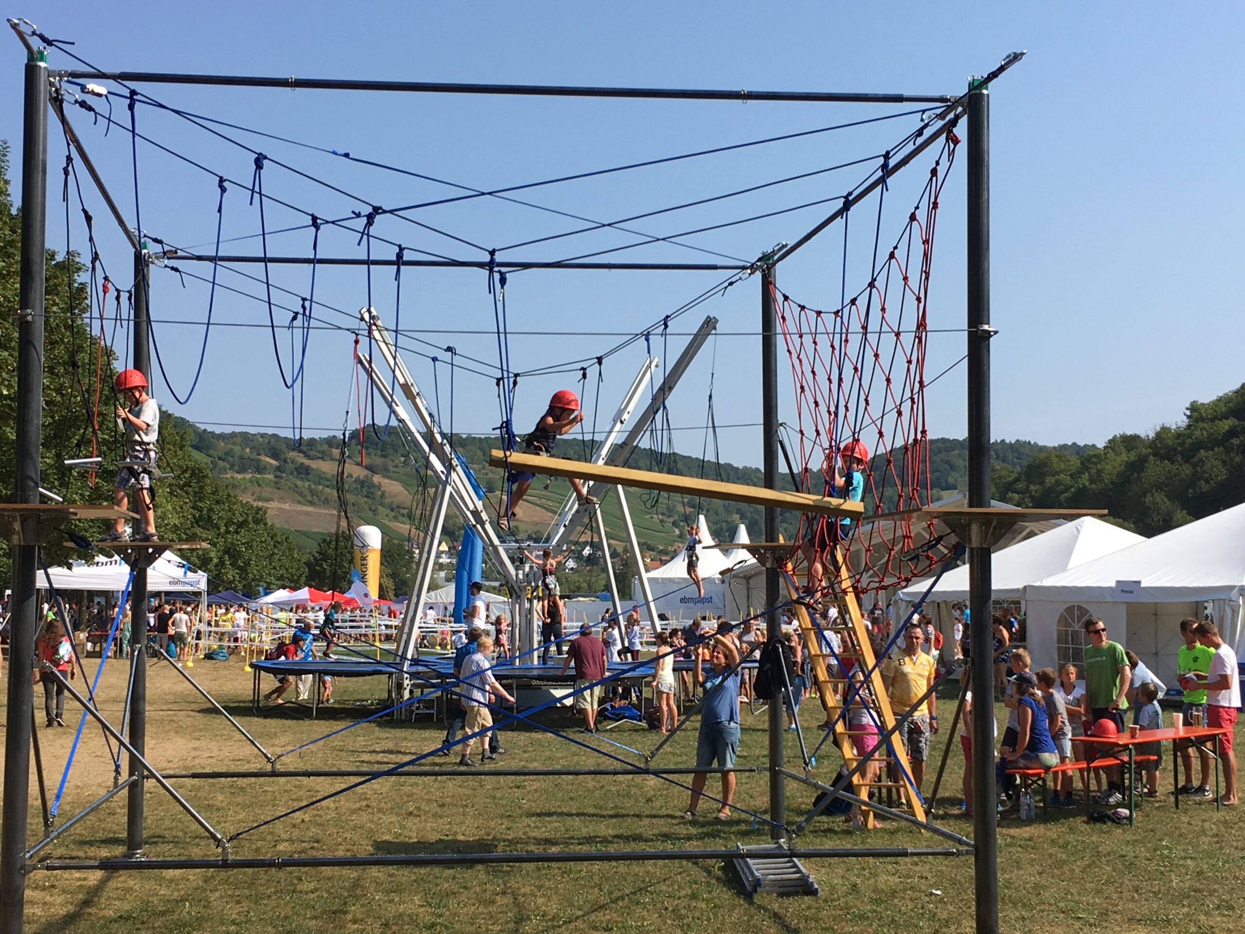 Hochmut kommt vor dem Fall! Eine der neuesten Erfindungen der K5-Ideenschmiede ist ein eigens für Kinder und Jugendliche entwickelter Hochseilgarten, der Spannung, Nervenkitzel und viel Spaß garantiert. Der K5-Kinder-Hochseilgarten ist ideal, um Kinder zu fördern und um Erfolgserlebnisse erlebbar zu machen. Es gilt mit viel Konzentration sich selbst einschätzen zu lernen und durch balancieren, klettern und hangeln die wackeligen Übergänge zu meistern. Das Modul ist mit einem umlaufenden Personensicherungssystem und einer professionellen Ausrüstung ausgestattet und macht es so zu einem sicheren Vergnügen auf Ihrem Event. Es besticht durch edle Optik in Carbon und Silber und lässt sich wie jedes K5-Event-Modul individuell branden.
