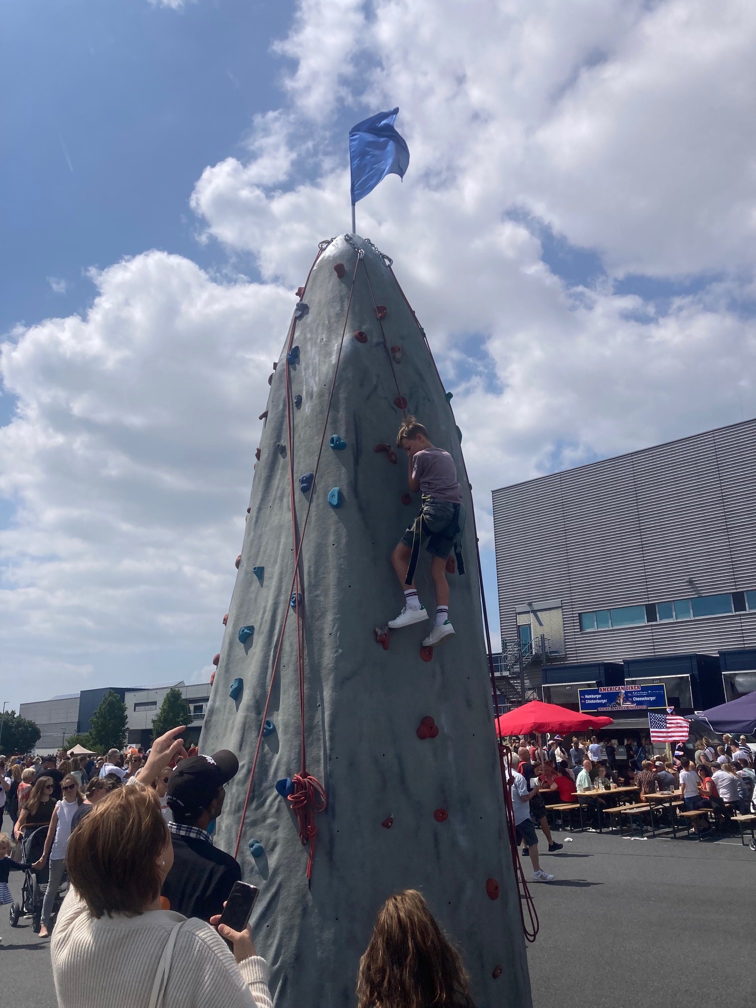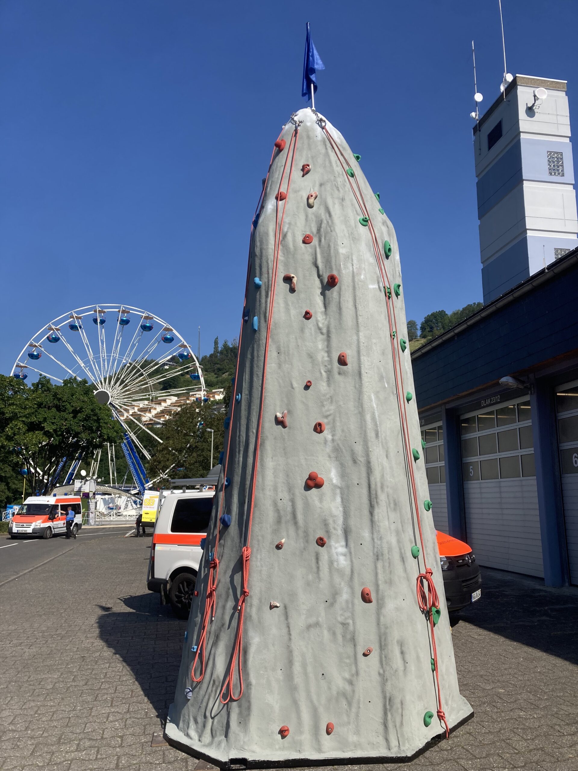 Der Berg ruft! Der freistehende, sechs Meter hohe Struktur-Kletterberg ist ein Highlight und Blickfang auf Ihrer Veranstaltung. Er trägt eine Gipfelfahne und mit einer Toprope-Sicherung geleitet er jeden Besucher sicher in die Höhe. Der Berg wird nicht nur Ihre jungen Besucher begeistern, denn er bietet Kletterspaß für jeden! Praktisch ist, dass er keine langen Auf- und Abbauzeiten benötigt und individuell gebrandet werden kann. Vom Logo auf der Gipfelfahne bis hin zu Werbeplatten auf den Kletterflächen