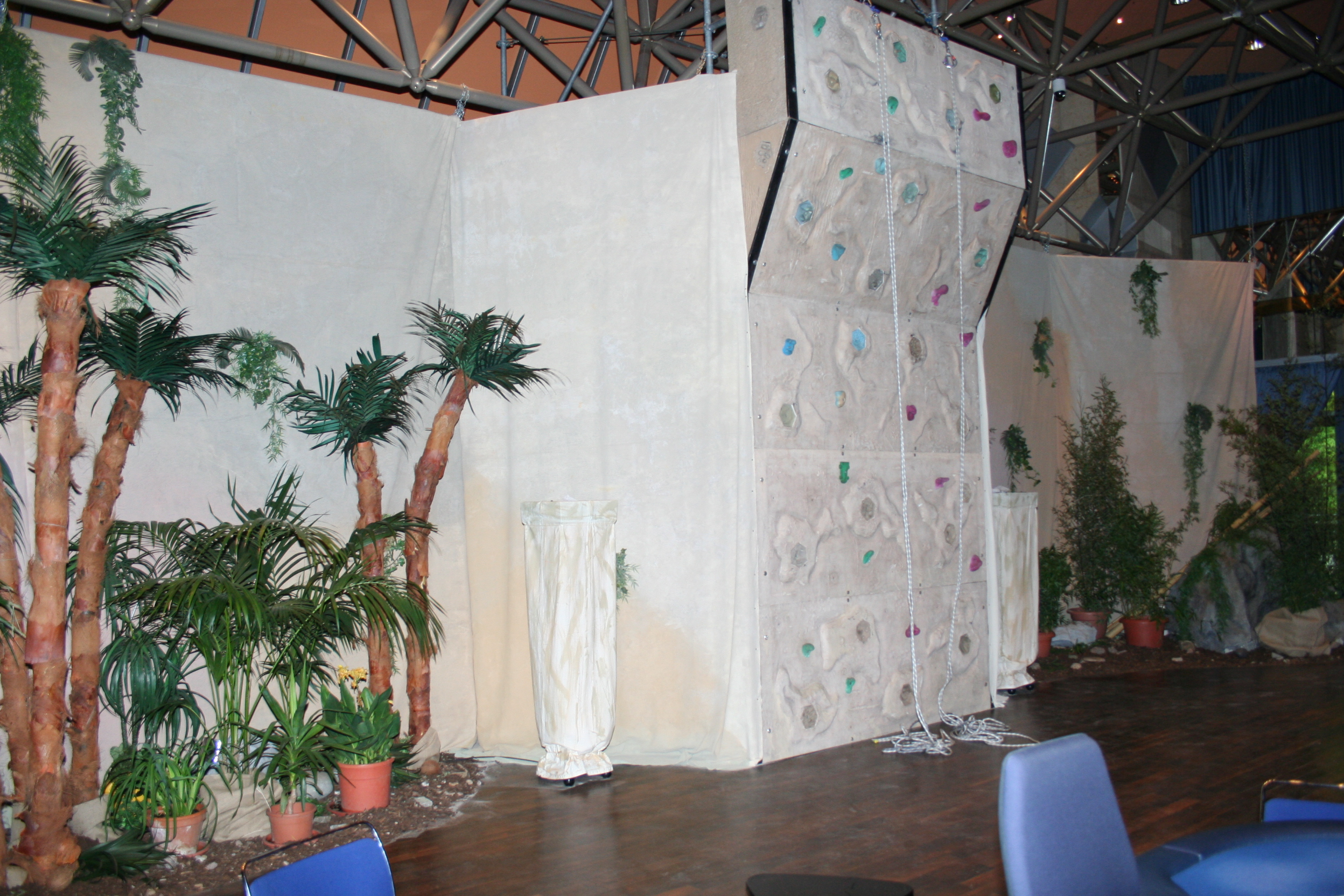 Gipfelstürmer! Eine fünf Meter hohe Kletterwand mit echter Felsstruktur, einem Überhang und insgesamt drei verschiedenen Kletterrouten sorgt für Nervenkitzel pur. Sie kann überall (In- und Outdoor) aufgebaut werden, da sie sogar durch normal große Türen passt und in der Höhe variabel, an jede Raumhöhe anpassbar ist. Wie alle K5-Event-Module ist sie auf dem neuesten Stand der Technik und Sicherheitsvorschriften für mobile Kletteranlagen.